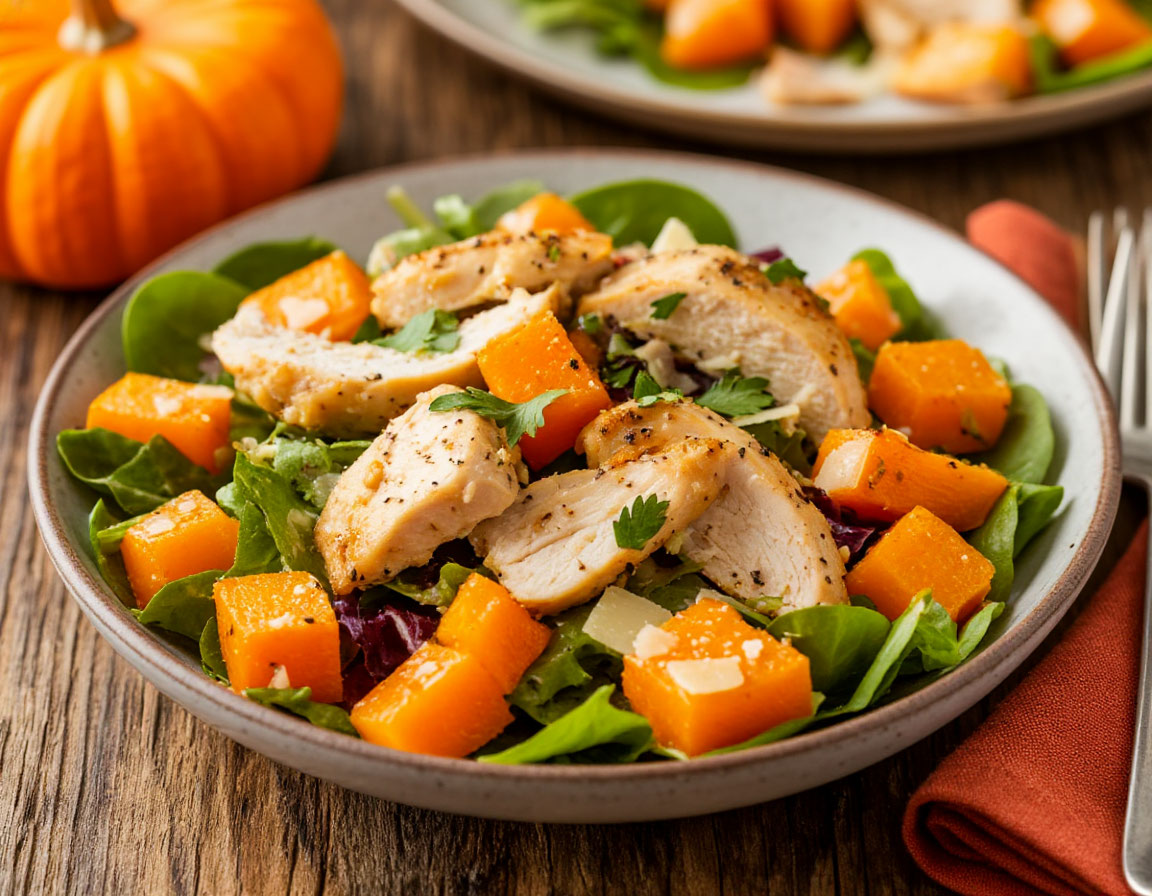 Легкий и вкусный: рецепт салата из запеченной тыквы, курицы и сыра