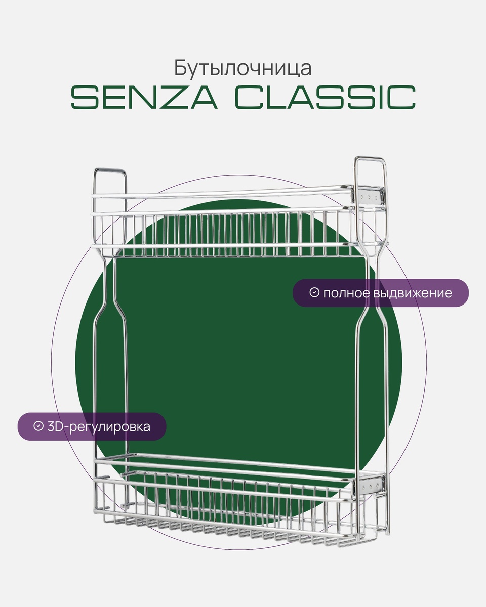 SENZA Classic — идеальное решение для тех, кто ценит удобство и рациональность на кухне. Бутылочница помогает использовать каждый сантиметр пространства и сохраняет порядок в шкафу. 🔹 Плавное и бесшумное движение Благодаря системе Soft Close и направляющим Sincrono, модули закрываются мягко и без рывков. 🔹 Полное выдвижение Все содержимое доступно с первого взгляда — ничего не теряется в глубине шкафа. 🔹 3D-регулировка фасада Точная настройка по высоте, ширине и глубине обеспечивает идеальное прилегание фасада. 🔹 Высокая нагрузка — до 35 кг Прочная стальная конструкция выдерживает вес бутылок, банок и других тяжёлых предметов. ✨ Доступна в двух размерах базы — 150 мм и 200 мм, с левым или правым креплением. 👉 Узнайте подробнее на нашем сайте https://senzamf.ru/products/vydvizhnye-korziny/butylochnica-senza-classic