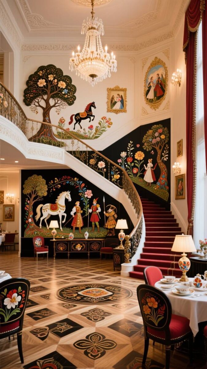 Сказочные узоры, которые рассказывают о русской культуре. В настоящее время Русский дом активно развивает мебельную индустрию, и было бы очень интересно видеть в изделиях всё больше традиционных русских народных промыслов, выполненных мастерами! Палехская миниатюра — это не просто художественный промысел, а живое наследие русской культуры, возникшее в первой половине XX века в посёлке Палех. Основанная на древних иконописных традициях XVII века, она сочетает яркую темперную живопись и тонкую работу с лаковой поверхностью из папье-маше. Основные цвета — насыщенный чёрный фон, деликатные оттенки темперы на основе яичного желтка и изящное золото, придающее изображению изящество и глубину. Мотивы миниатюры черпают вдохновение из сказочных сюжетов, литературных образов, баллад и песен. В современном интерьере такие изделия, как шкатулки, картины или декоративные элементы, создают атмосферу утончённой элегантности и культурного богатства. Посмотреть образцы можно в Музее лаковой миниатю