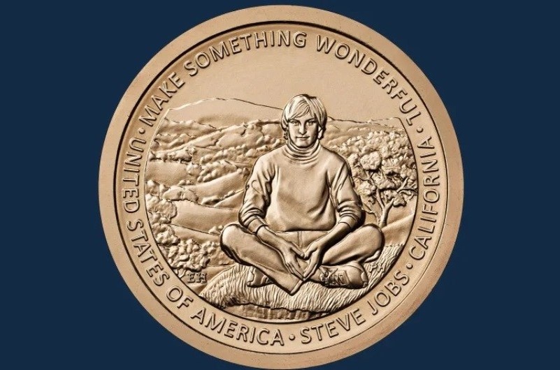 Монетный двор США выпустил дизайн памятной монеты номиналом 1 доллар, посвящённой соучредителю и бывшему генеральному директору Apple Стиву Джобсу (Steve Jobs). На монете изображён молодой Джобс, сидящий со скрещёнными ногами на фоне холмов Калифорнии и одетый в водолазку, что выглядит вполне естественно.