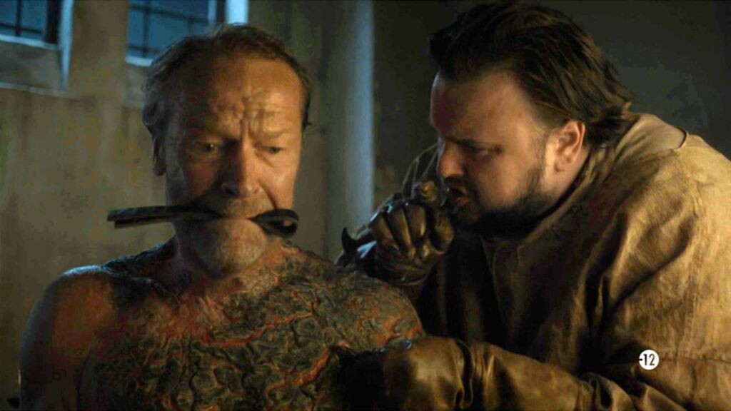Как описана: В сериале мы видим её развитие на примере Джораха Мормонта. Болезнь начинается с пятен на коже, которые постепенно каменеют, лишая чувствительности и превращая тело в статую. Лекарства нет, а сам больной изгоняется из общества, как прокаженный. Это болезнь-одиночество, болезнь-забвение.