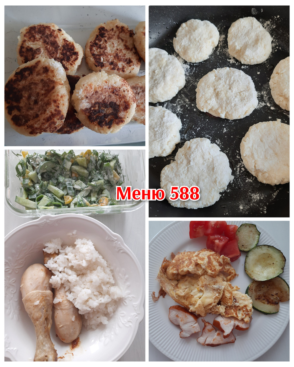 #Завтрак – сырники. 350г творога, желток от яйца, 100г сахара, 4 столовые ложки муки (тут на глаз), ванилин, чуть-чуть разрыхлителя. Все перемешать. Муки добавляйте столько, какой результат хотите. Если нравится, когда чувствуется творог – то пару ложек всего. А мне захотелось, чтобы было похоже на выпечку – тут муки нужно побольше. Берем шарик, скатываем, обваливаем в муке, формируем шайбочку. И обжариваем сырники на топленом масле. Получились приятно сладкие. К сырникам – только сметана. Сладкого уже ничего не нужно, в виде варенья например. #Обед – отварной рис. Тушеные на воде куриные голени – только соль и перец сверху. Салат из огурца, болгарского перца, укропа и зеленого лука. Соль и заправка из сметаны. #Ужин – смазала сковороду топленым маслом и чуть обжарила карпаччо. Давно мне не попадалось карпаччо в магазине. А тут было и я взяла. Омлет из 2х яиц и молока. Помидор. И обжаренные кабачки с солью и перцем на топленом масле.