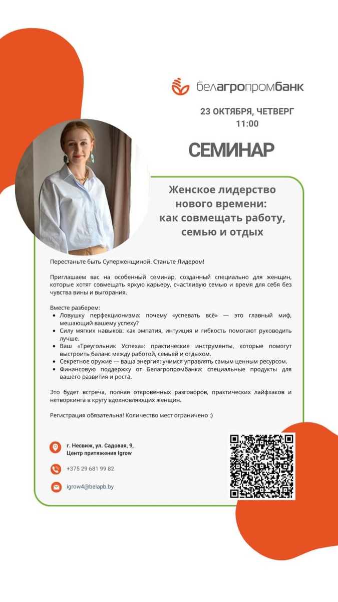 ✅ Белагропромбанк приглашает на уникальный бесплатный семинар для женщин: «Женское лидерство нового времени: как совмещать работу, семью и отдых» ➡️ Подробности — на нашем САЙТЕ.