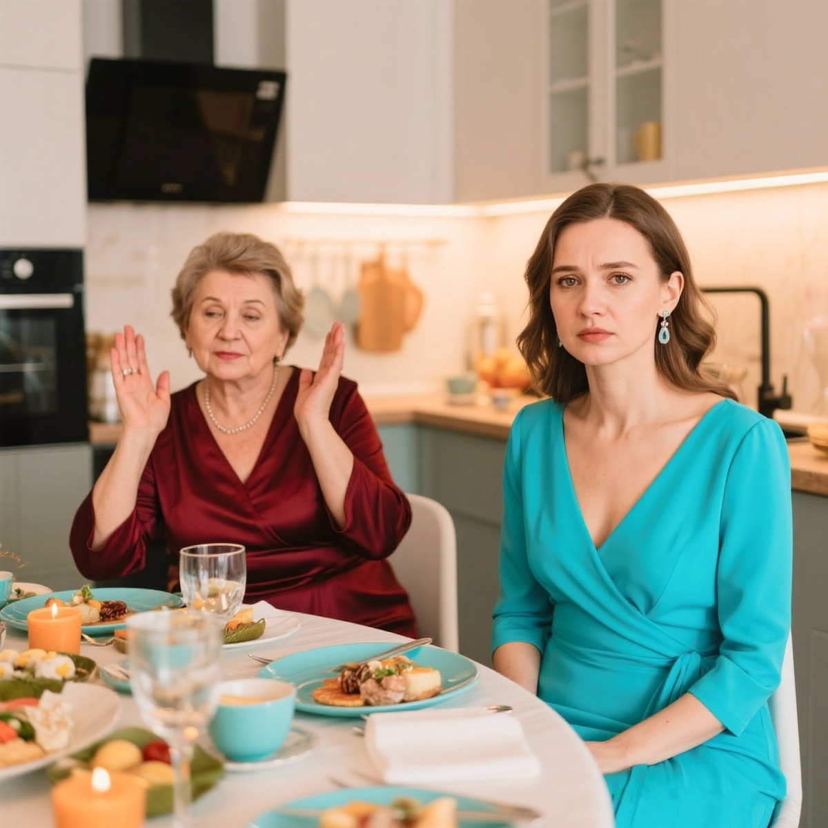 Тишина повисла такая, что было слышно тиканье часов на стене. Вера Петровна сидела бледная, с опущенной головой. Алексей смотрел то на мать, то на жену, и не мог вымолвить ни слова.