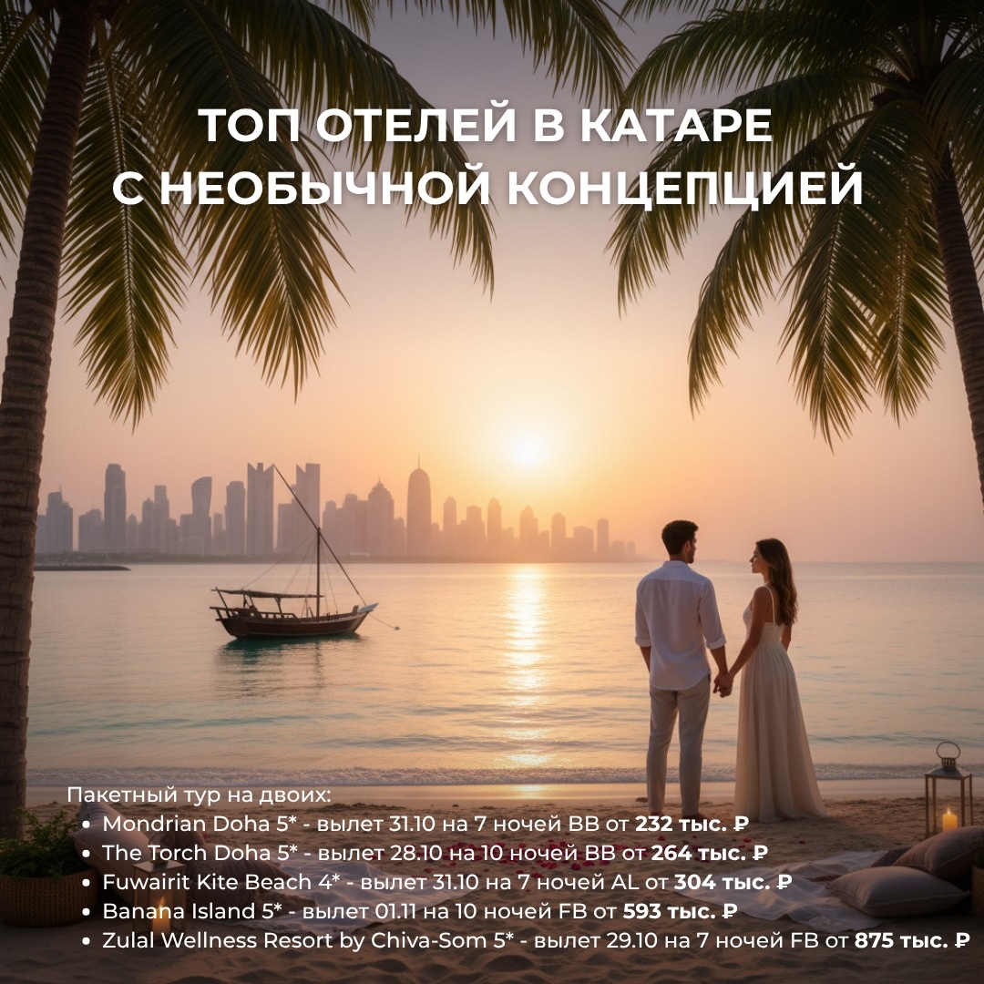 Помимо курортов-дворцов известных сетей и разнообразных городских гостиниц, в Катаре есть несколько отелей, которые подарят вам необычный опыт отдыха и станут яркой страницей в ваших воспоминаниях. 🪩 Mondrian Doha 5* Голландский дизайнер создал отель-сказку "Алиса в стране чудес" и сейчас это самое модное и эпатажное место в Дохе. Спа-центр с витражным куполом, тусовочный бар и бассейн на крыше, лифт покрытый золотом и стейк-хаус уровня Мишлен. * Mondrian Doha 5* с вылетом 31.10 на 7 ночей на двоих на BB - от 232 тыс. ₽ 🔥 The Torch Doha 5* Этот пятизвездочный отель представляет собой 300-метровый факел. Здание находится в самом сердце спортивного городка Дохи, окруженное парками, аренами и бассейнами. * The Torch Doha 5* с вылетом 28.10 на 10 ночей на двоих на BB - от 264 тыс. ₽ 🏄🏻♂ Fuwairit Kite Beach, Tapestry Collection by Hilton 4* Современный молодёжный и семейный отель в часе езды от Дохи для желающих активно провести отдых. Кинотеатр под открытым небом и бассейн с подогрев