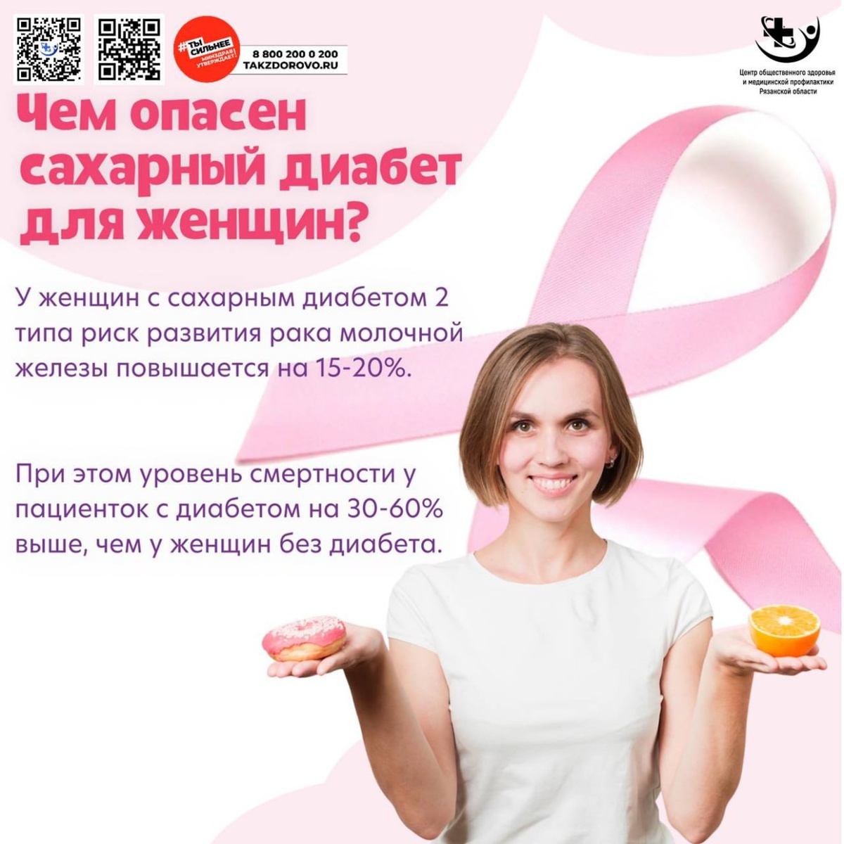 Октябрь — месяц борьбы с раком молочной железы. 💗 Пока мы говорим о профилактике РМЖ, важно помнить и о других угрозах. Сахарный диабет — особо опасен для женщин: 🔻 Главные риски: В 4-6 раз выше риск инфаркта и инсульта Нарушения мочеполовой системы (циститы, молочница) Осложнения беременности (гестационный диабет) 🔻 Угрозы для репродуктивного здоровья: Ранняя менопауза Поликистоз яичников Сложности с зачатием 🔻 Особая связь с онкологией: Диабет увеличивает риск развития рака молочной железы на 20-27%. 💡 Важно: Контроль сахара, регулярные осмотры у гинеколога и маммолога — ваша лучшая защита. Берегите себя комплексно! Ваше здоровье заслуживает внимания каждый день. ❤ #ДиабетИЖенскоеЗдоровье #РакМолочнойЖелезы #ОктябрьРозовый #СахарныйДиабет #здоровоебудущее #ЗдоровоеБудущее62 #ЗдороваяРязань