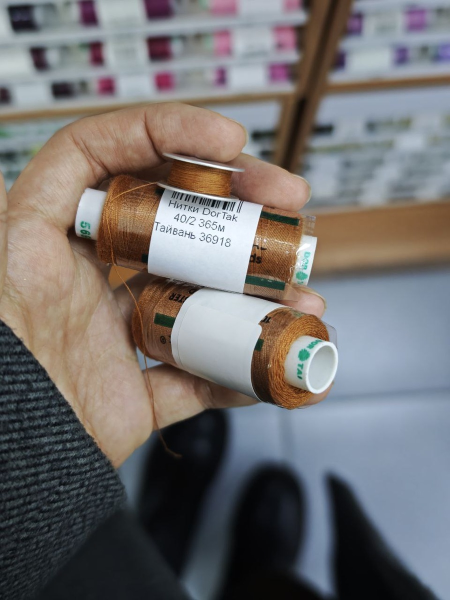 Пока сын на тренировке нашла нитки в тон к сумке 😌 Мне нравится ассортимент ниток в Швейном мире, раньше ездила на Ленинский, а сегодня на Варшавку. Кстати, у них была акция на нитки Мадейра 2+1 , две берешь и третья в подарок, кроме чёрной и белой. Ещё подобрала нитки Дортак и Мадейра к своему будущему костюму ☺ обычно беру для оверлока 4 и 1 для отделочных строчек
