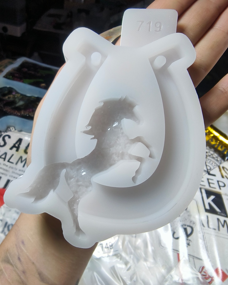 Я не хотела, чтобы это была просто подкова, а чтобы она была с лошадкой и нашла просто идеальный для себя молд: подкова, в которую можно напихать разных наполнителей, а лошадка кристаллическая.