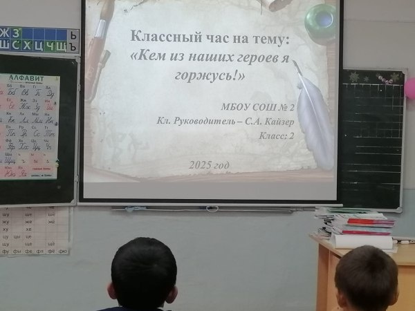 В МБОУ СОШ 2, во 2 коюлассе прошёл классный час:»Кем из наших героев я горжусь!» Ребята вспомнили героев прошлых лет и настоящего времени