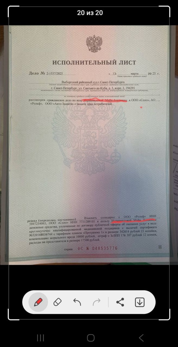 Получили исполнительный к АО Рольф по сертификату ООО Соло