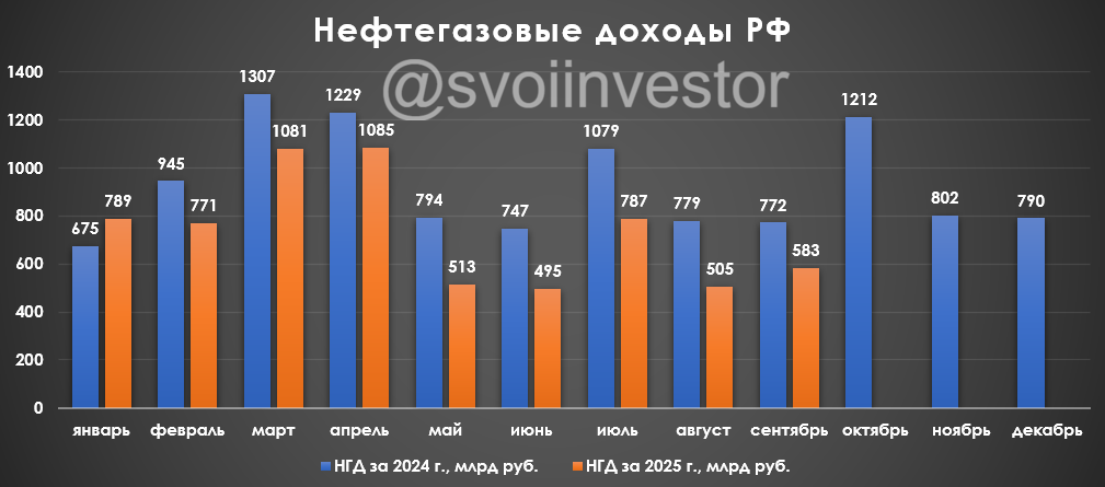 🛢️ По данным Минфина, НГД в сентябре 2025 г. составили 582,5₽ млрд (-24,5% г/г), месяцем ранее — 505₽ млрд (-35,1% г/г). Нефтегазовые доходы продолжают снижаться по отношению к прошлому году, всё из-за укрепления ₽, январских санкций, пошлин и снижения цены на сырьё (средний курс $ в сентябре 2024 г. — 91,2₽, цена Urals — 63,57$). Средний курс $ в сентябре 2025 г. составил 83₽ (в августе — 80,1₽), средняя же цена Urals снизилась до 56,82$ за баррель по данным МИНЭК (в августе — 57,55$), как итог цена за бочку в сентябре была равна ~4716₽ (в августе — 4610₽). С новыми правками по бюджету средний прогнозный курс $ за 2025 г. снизился с 96,5 до 94,3₽, цена Urals сократилась с 69,7 до 56$, августовские поступления для бюджета катастрофически малы. Рассмотрим полноценно отчёт: 🗄 НДПИ (677,2₽ млрд vs. 675,7₽ млрд месяцем ранее). РФ в 2024 г. 6 месяцев не придерживалась плана сокращения, в начале 2025 г. происходила компенсация по добыче за ранее превышенные квоты, но начиная со II кв. РФ у