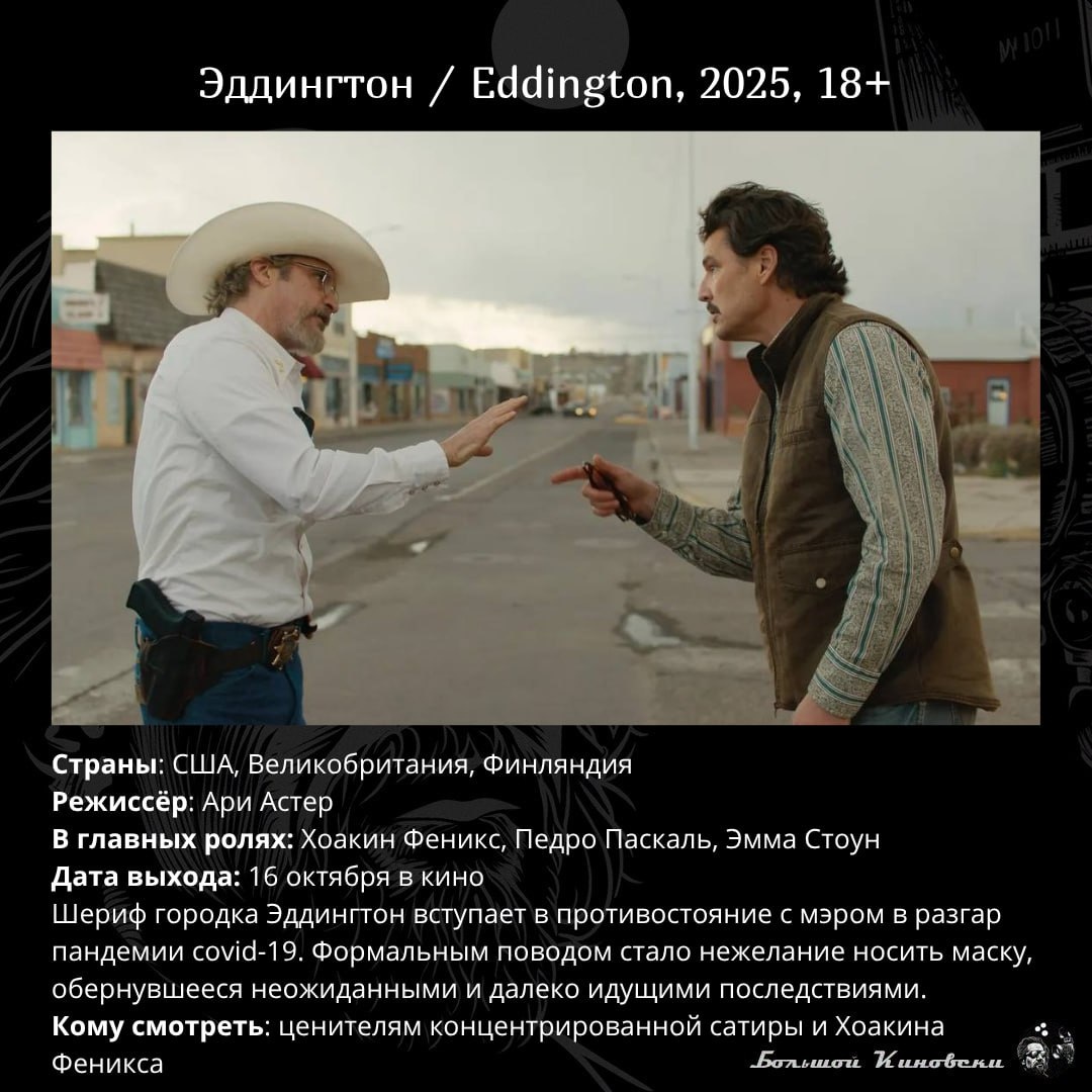«Эддингтон» на большом экране, Эмма Томпсон в триллере «Точка замерзания», Оливия Колман и Бенедикт Камбербэтч в комедии «Супруги Роуз» В кинотеатрах, на стримингах и просто в сети (мы против пиратства, но часто хорошее кино не пускают в прокат, а часть сервисов прекратили работу в РФ) выходят десятки фильмов. Из общей массы мы выделяем самые интересные, которые стоит (или не стоит) посмотреть. P.S. С 16 октября в прокате драма Бакура Бакурадзе «Лермонтов», а 21 – состоится цифровой релиз «Долгой прогулки» по Стивену Кингу, о которых писали подробно. В ближайшее время также расскажем об инди-хорроре «Глазами пса». Большой Киновски 🎬| #Премьеры_недели
