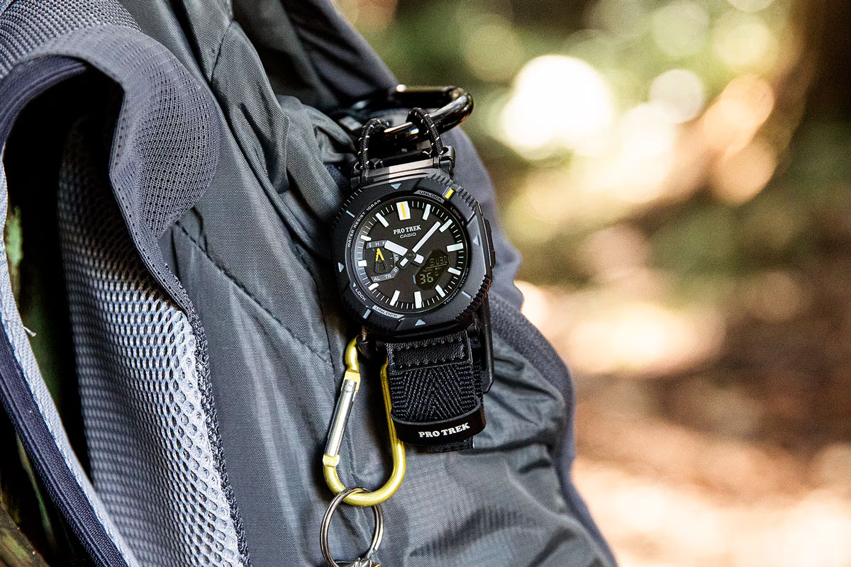 В рамках очередной «партии» новинок сентября касиовцы показали PRJ-B001B-1 — еще одну модель необычной серии PRJ-B001. Почему необычная? Все просто — мы с вами привыкли к наличию датчиков, как обязательному атрибуту линейки PROTREK, все-таки речь о часах для туризма и походов… В случае с PRJ инженеры CASIO решили отклониться от традиционного наполнения модуля и сфокусировались на размерах, практичности и удобстве. Насколько оправдан такой подход, судить не будем, поэтому давайте смотреть на новинку. Узнать цены на PRJ-B001 *Только официальные магазины PRG-B001 сильно отличаются от того, что мы видели ранее в линейке PROTREK, и мы сейчас говорим именно о дизайне. Все элементы конструкции корпуса преследуют лишь одну цель — максимальное удобство на запястье. Напомним, серия на сегодняшний день самая легкая среди всех существующих «треков» — всего 44 грамма на обычном ремешке и 37 гр. на банджи (как в этом случае). При этом размеры корпуса скорее средние (50.3 × 46 × 13.6 мм, есть и помен