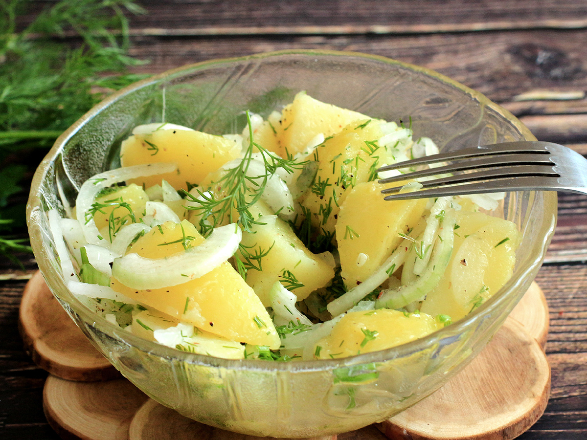Картофельный салат, который на вид кажется пустым, но стоит попробовать – и всё, пошёл-пошёл, ложка за ложкой! Он вкусный, сытный, дешёвый – и не надо ничего изобретать.