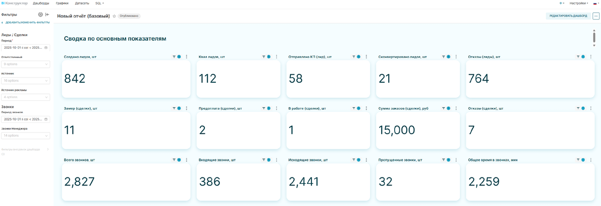 В BI-Конструкторе данные обновляются каждый час, поэтому отчет всегда актуален без необходимости ручных выгрузок.