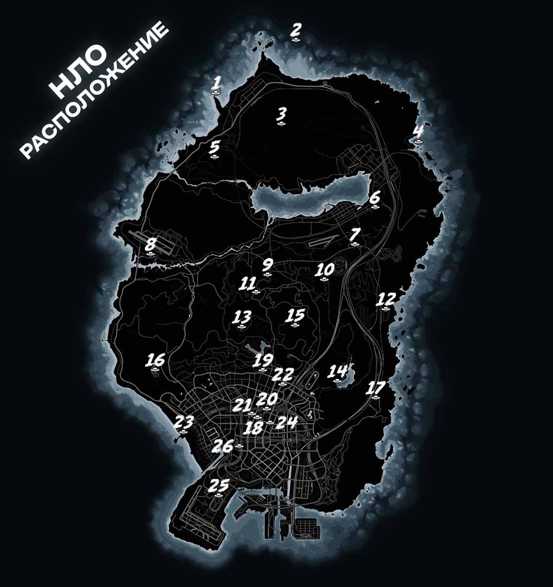 С 14 октября в период с 22:00 до 04:00 ежедневно игроки ГТА Онлайн смогут наблюдать НЛО. На карте ниже указаны места появления этих летающих объектов.