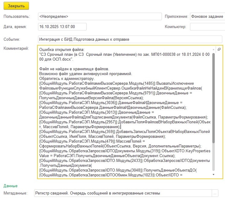 После обновления 1С Документооборот на версию 3.0.18.19 перестал работать обратный обмен из ДО в ERP. Например, у нас перестал обновляться статус согласования документа и возвращаться в 1C ERP. Такое бывало и раньше, но обычно помогала перезагрузка сервера или перепубликация баз, но в этот раз причина была другая. В этой версии зачем-то изменили логику регламентного задания и система стала проверять битые файлы, и, если находила, то стопорилось регламентное задание. В журнале регистрации фиксировалась ошибка по событию Интеграция с БИД. Подготовка данных к отправке (Регистр сведений. Очередь сообщений в интегрированные системы). Т.е. для продолжения интеграции я пометил на удаление битый файл и поток обновления пошел. Зачем 1С сделали блокировку обмена при битом файле — не понятно… Код стека для индексации: Ошибка открытия файла: "СЗ Срочный план (в СЗ Срочный план.docx". Файл не найден в хранилище файлов. Возможно файл удален антивирусной программой. Обратитесь к администратору. {Общ