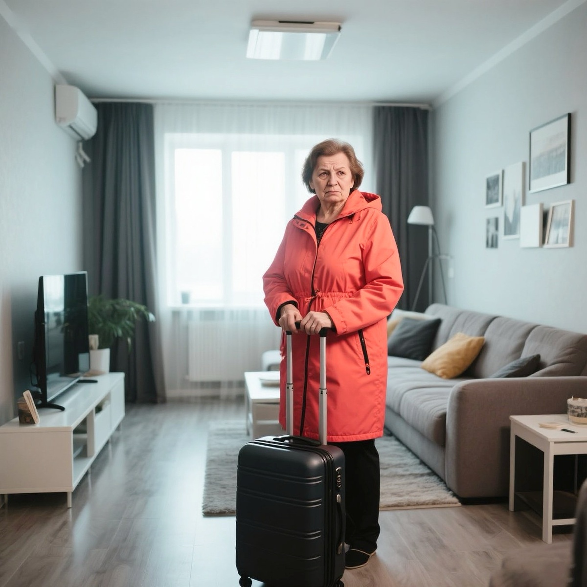 Мы вышли на лестничную площадку. Светлана Петровна стояла у лифта, опираясь на два огромных чемодана. На ней было тёмно-синее пальто, на голове — платок, на лице — выражение усталости и какой-то странной решимости.