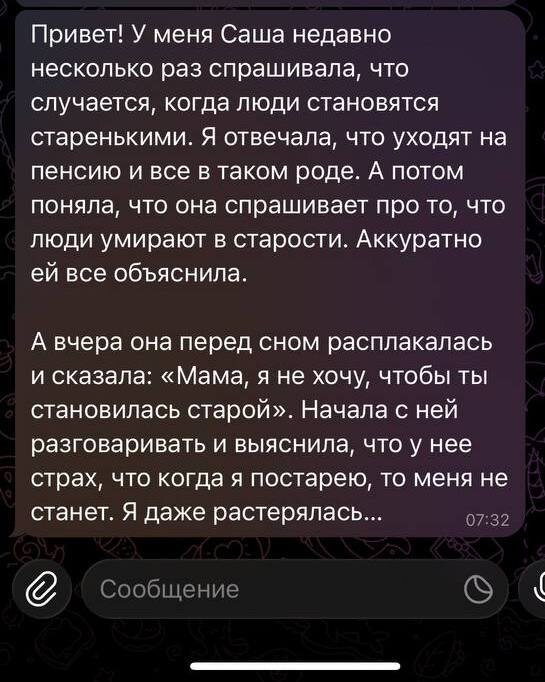 Вчера подруга прислала такое сообщение. Девочки, было ли у вас такое? В каком возрасте ваши дети впервые начали задавать вопросы о смерти? Как реагировали?