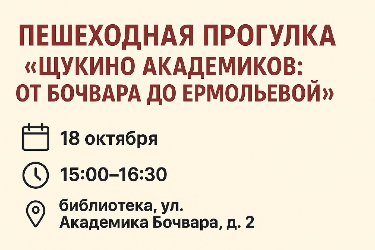 ✨ ПЕШЕХОДНАЯ ПРОГУЛКА «ЩУКИНО АКАДЕМИКОВ: ОТ БОЧВАРА ДО ЕРМОЛЬЕВОЙ» 12+ 📚 Проводит: библиотека №243 Северо-Запада Москвы 📅 Дата: 18 октября 🕒 Время: 15:00–16:30 📍 Место встречи: библиотека, ул. Академика Бочвара, д. 2 🚶♀️ Приглашаем на увлекательную прогулку «Щукино академиков: от Бочвара до Ермольевой»! Начнём в библиотеке и отправимся к Государственному научному центру РФ — ФМБЦ им. А.И. Бурназяна, куда доставили первых ликвидаторов аварии на Чернобыльской АЭС. 🏛 Затем увидим знаменитый дом с колоннами, где жил академик Л.А. Зильбер, и пройдём к НИЦ эпидемиологии и микробиологии им. Н. Ф. Гамалеи — по улице Академика Ермольевой, названной в честь выдающейся микробиологини и создательницы советских антибиотиков Зинаиды Виссарионовны Ермольевой. 📞 Телефон для справок: +7 (499) 193-54-92 🔗 Регистрация: obraz243.timepad.ru/event/3593120 #Щукино #Библиотека243 #Прогулка #Москва #История #Академики #Ермольева #Бочвар #Зильбер #Гамалеи #СевероЗападМосквы #МероприятияМосква