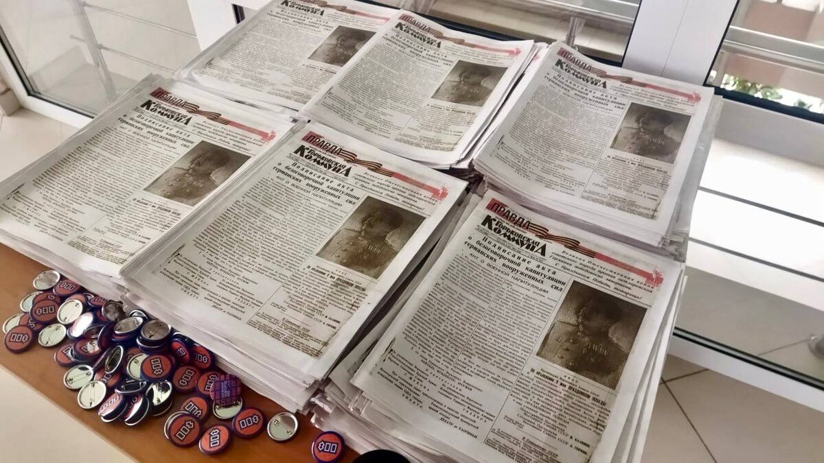 Гости выставки получили спецвыпуск "Нижегородской правды" с материалами о Великой Отечественной войне, а также увидели предметы, найденные поисковиками на местах сражений: каски, котелки и многое другое. Экспонаты предоставила областная организация "Курган".