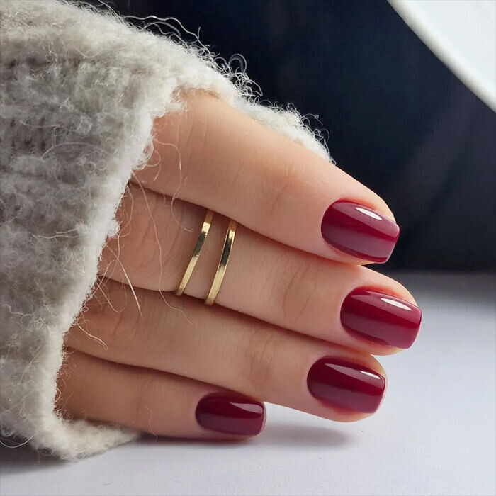 Цвет черной вишни, пожалуй, один из самых благородных и дорогих. Эффектнее всего он смотрится на коротких и средних ногтях квадратной формы со скругленными краями.