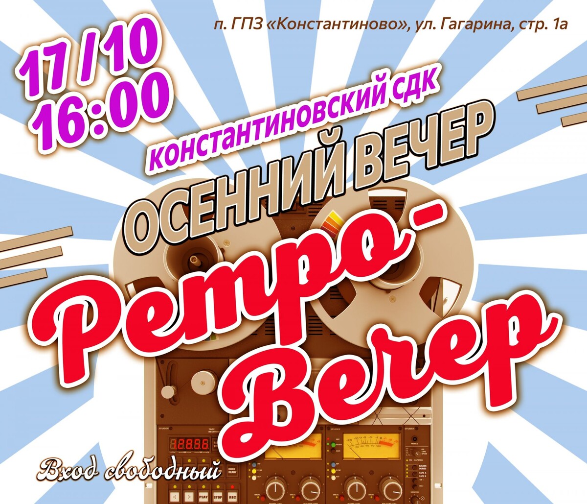 ✨ 🎉💃 Приглашаем вас на танцевальный ретро-вечер! 🕺✨ Погрузитесь в атмосферу золотых времён! Только самые лучшие и зажигательные ретро хиты, которые заставят вас танцевать до упада! 🎶❤ Не упустите возможность провести вечер в отличной компании и зарядиться позитивом! 🌟 🚫 Возраст: 18+ 📆 17.10.2025🕒16:00 🏢 Константиновский сельский дом культуры (СДК) 📍 г.о.Домодедово, пос.Государственного племенного завода Константиново, ул.Гагарина, д.1А 💰 Вход свободный❗️ ✅ Мероприятия Домодедово https://dzen.ru/id/66f10385cc4c5a16f7b5fb02 http://vk.com/domodedovo_events http://dzen.ru/domodedovo_events