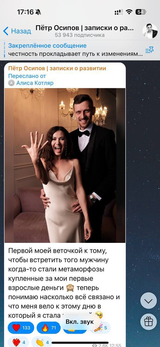 Меня репостнул Петя Осипов 🔥 и на меня подписалось сразу 26 человек! Но мой посыл вообще не об этом, потому что это следствие системного продвижения и проявленности. Я здесь хочу сказать о том, ЧТО послужило причиной этого комментария 🟧 благодарность и признание. Лично мне неприятно слышать на разборах негативные отзывы, обесценивание о наставниках, учителях и маркетологах, у которых учился тот или иной человек и "не получил ожидаемого результата". В таких случаях я четко осознаю, я буду следующей, о ком так будут говорить. Как про бывших, знаешь?) ❗️Я никогда не говорю плохо о том, кого выбрала в свои наставники. Даже если мой выбор не совпал с моими ожиданиями, это был мой выбор. И я убеждена, что каждый человек повлиял на то, где я нахожусь сейчас. У Пети я проходила Метаморфозы в далеком 2021 году. И я ставила тогда цель встретить своего мужчину, быть реализованной, выйти на стабильный доход. ✅ И пришла к этому, хоть и спустя 4 года, но пришла. И благодарна ему за это. Как