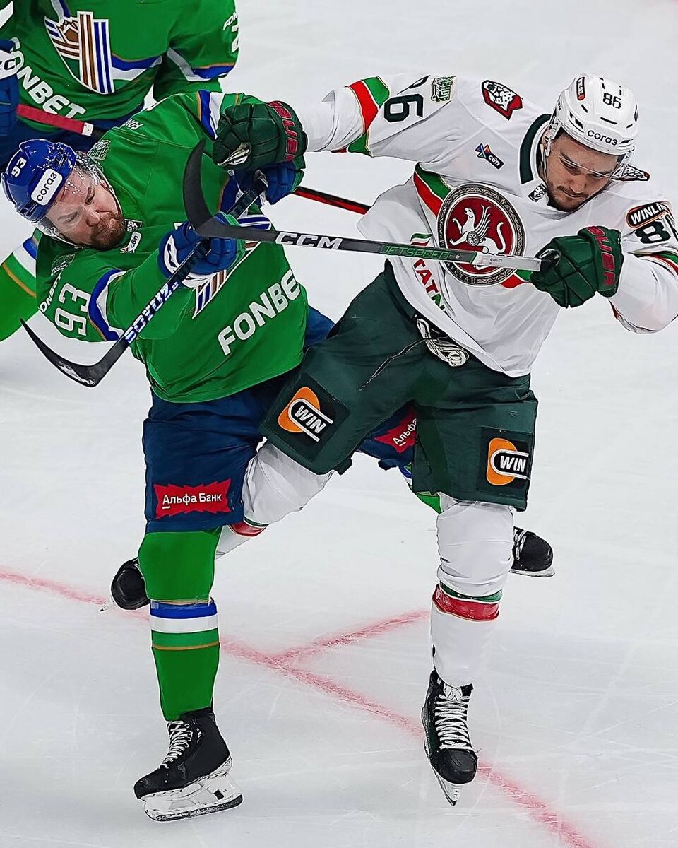 С самого начала матча гости взяли игру под свой контроль и уже на третьей минуте открыли счёт. Илья Сафонов, получив пас от Брэндона Биро, успешно реализовал бросок. На тринадцатой минуте казанская команда упрочила свое превосходство: Дмитрий Яшкин, подставив клюшку под шайбу, пущенную от борта, удвоил результат. Не прошло и тридцати восьми секунд, как капитан команды из Уфы, Григорий Панин, смог отквитать одну шайбу, сократив разрыв. Однако, перед самым завершением первого периода, Степан Фальковский вновь увеличил разницу в счете до двух шайб. Казанцы продолжали доминировать на площадке и сумели использовать одно из двух предоставившихся численнных преимуществ. Александр Хмелевский, благодаря голевым передачам от Григория Денисенко и Митчелла Миллера, забросил свою дебютную шайбу в составе «Ак Барса». Этот гол вызвал бурную реакцию у уфимских болельщиков: вся «Уфа Арена», забитая до отказа, встретила своего вчерашнего кумира продолжительным свистом. Ближе к концу двадцатиминутного от