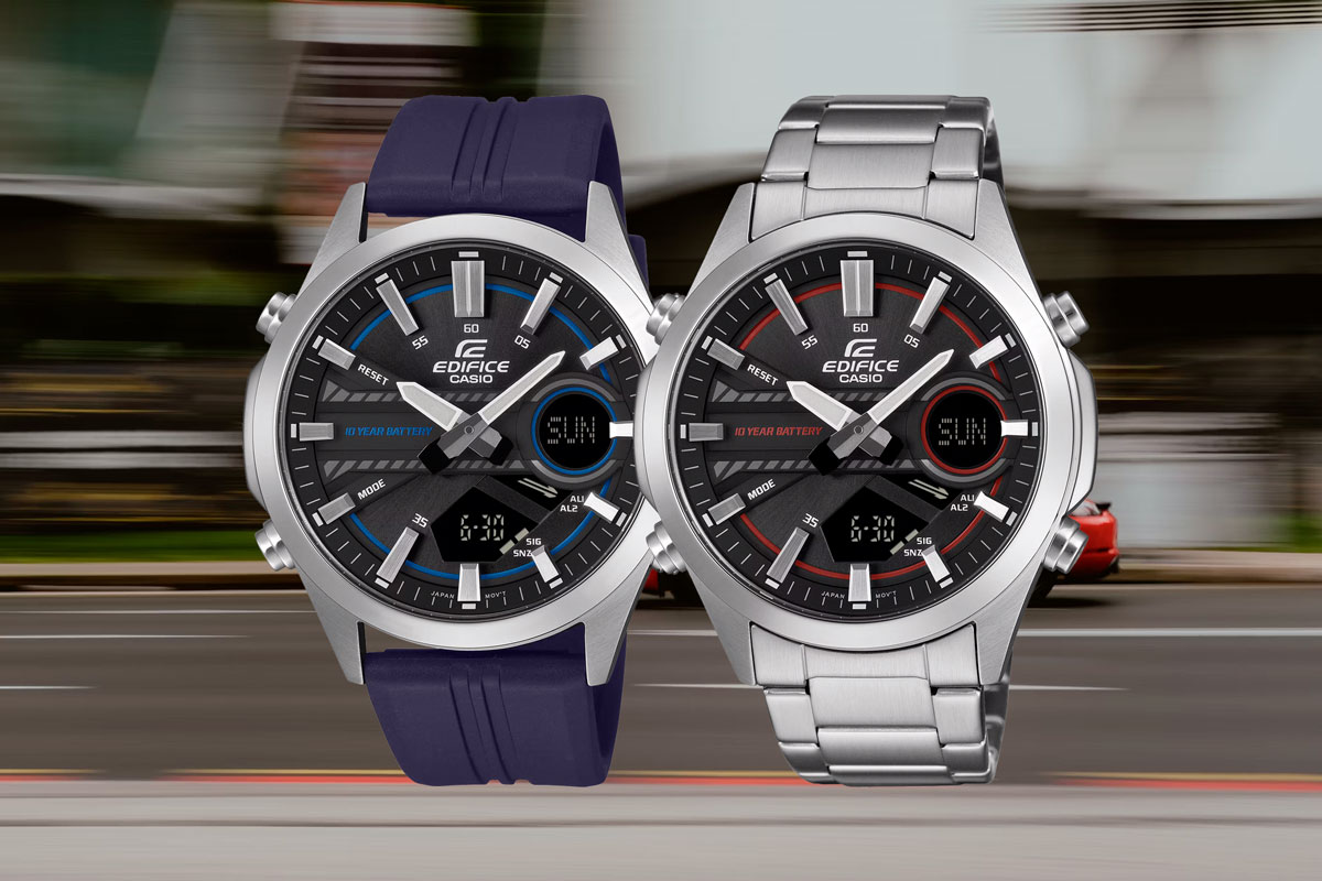 В октябре мы увидим пополнение в относительно новой серии EDIFICE EFV-C120, которое уже анонсировано на сайте международного подразделения CASIO. Речь о двух расцветках EFV-C120P-1A2 и EFV-C120D-1A4 — представителях автомобильной линейки с дизайном в духе автоспорта. В отличие от первых версий 120-й серии, новинки немного преобразились в сторону гоночной стилистики — имеем ввиду новые контрастные детали на циферблате, такие как красная/синяя обводка по периметру дисплея и «штрихи» в блоке центральной части, напоминающие элементы дорожной разметки. Кроме этого, появились подписи у некоторых часовых индексов (там где позволило свободное пространство) в виде числовых обозначений. EFV-C120P-1A2 первый вариант серии на ремешке из каучука — после кожи и стального браслета часы выглядят более динамично и стильно. Вырезы по центру ремешка похожи на текстуру автомобильной шины, так что фанаты гоночной тематики оценят. Размеры корпуса вы уже знаете из прошлых статей — 49.5 × 45.5 × 13.7 мм, стан