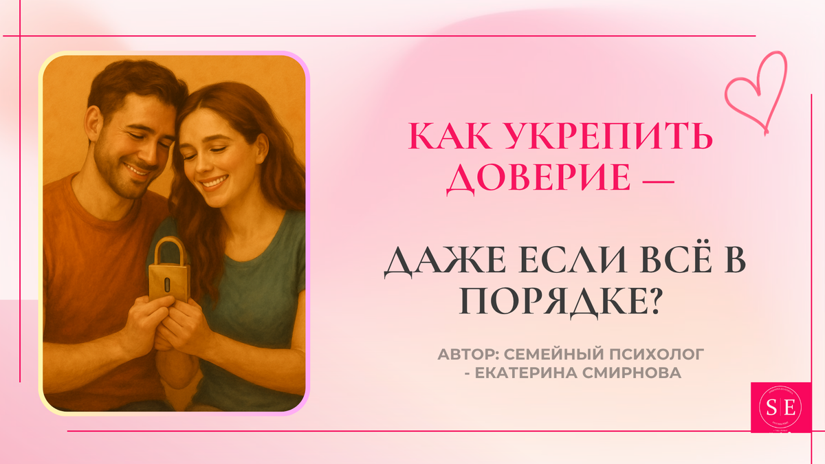 Автор: Екатерина Смирнова — семейный психолог, эмоционально-фокусированный терапевт, опыт с 2017 года Мы часто приходим к теме доверия, когда оно уже нарушено: измена, обман, отдаление. Но доверие — это не только восстановление после боли. Это ежедневная тонкая работа, даже если отношения кажутся хорошими. Эта статья — о том, как укреплять доверие в паре заранее, чтобы не разбирать руины, а строить фундамент. Это не «я тебе верю». Это: В эмоционально-фокусированной терапии доверие — это уверенность в доступности и отклике партнёра. Доверие — это не бонус. Это клей, который держит отношения, когда штормит. Сказали, что позвоните — позвоните. Обещали купить хлеб — купите. Надёжность в мелочах рождает глубокое спокойствие. Даже если это: «я устал» или «мне тревожно». Это лучше, чем отдалиться и замолчать. Открытость — это приглашение в контакт. «Ну ты опять начинаешь!» — разрушает.