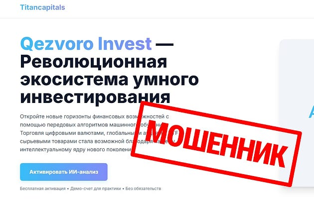 Titancapitals — это псевдоинвестиционный проект, действующий под брендом QezvoroInvest. На сайте https://titancapitals.org обещают “инвестиции с искусственным интеллектом” и “гарантированные прибыли до 87%”, но на деле перед нами — классический инвестиционный скам. Банк России официально внёс Titancapitals в список нелегальных компаний с признаками мошенничества. Компания создаёт иллюзию профессиональной инвестиционной площадки, но в реальности: На форумах люди рассказывают, как потеряли средства после “инвестиций” в QezvoroInvest и Titancapitals. Жалобы типичные: Titancapitals (titancapitals.org) — это финансовый скам и обман, а не реальный брокер.