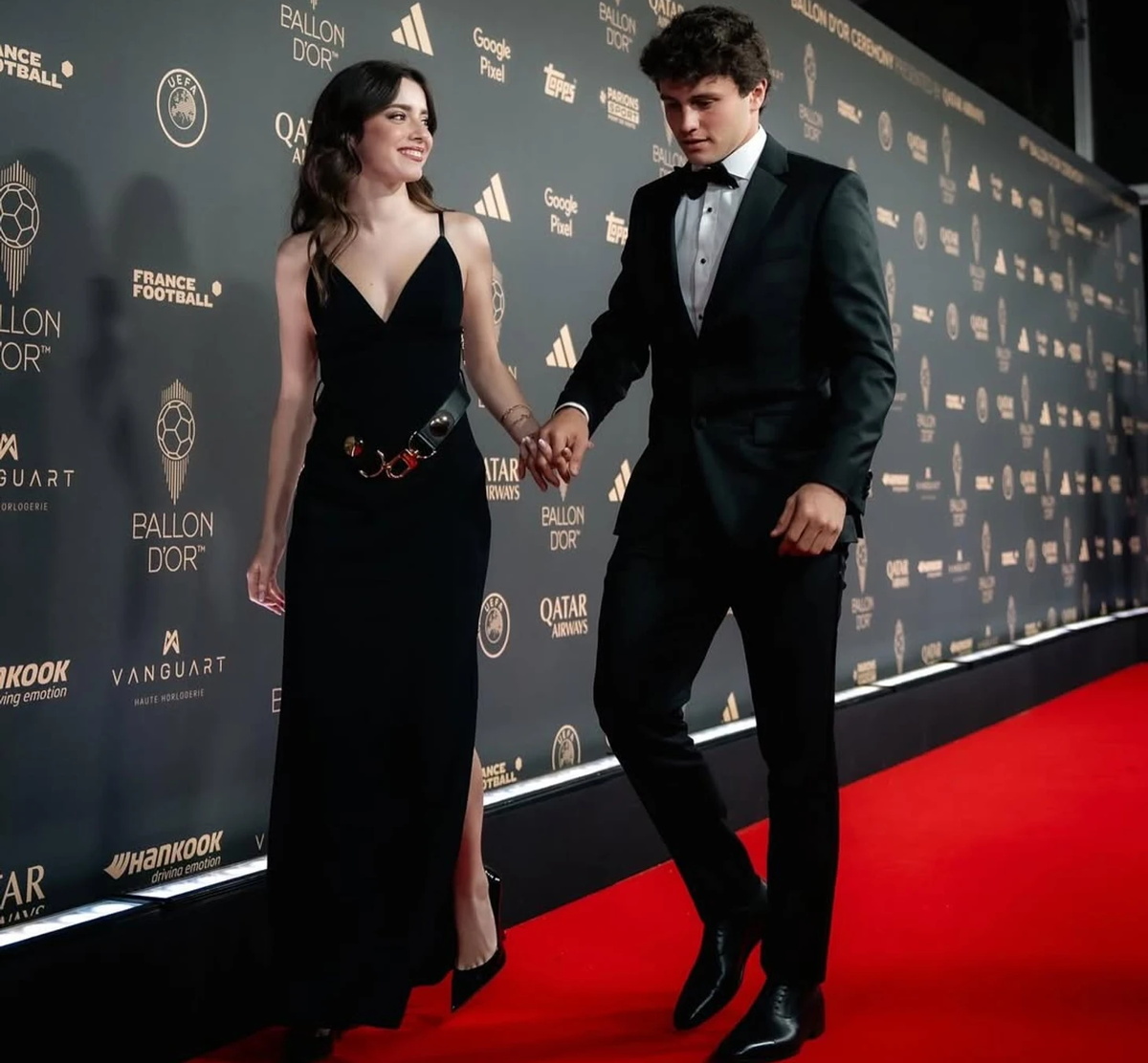 Жоау Невеш впервые в карьере был номинирован на «Золотой мяч». Португалец провёл отличный сезон в «ПСЖ» и вместе с клубом оформил квадрупл, победив в Лиге 1, Кубке и Суперкубке Франции, а также Лиге чемпионов. В итоговом голосовании за «Золотой мяч» Жоау Невеш занял 19-е место. Полузащитник «ПСЖ» набрал 40 баллов, опередив в гонке за трофей признанных футбольных звёзд Европы – Лаутаро Мартинеса, Эрлинга Холанда и Джуда Беллингема. На красной дорожке в Париже Жоау Невеш появился не один, а вместе со своей девушкой. Вашему вниманию – очаровательная Мадалена Арагао. Она сопровождает возлюбленного во время важных футбольных турниров и светских мероприятий. На церемонию Мадалена пришла в коктейльном чёрном платье на бретельках с глубоким декольте и небольшим разрезом на ноге. Образ был дополнен туфлями на высокой шпильке, кожаным поясом с объёмной пряжкой и лёгкой укладкой. Девушка Жоау Невеша – 20-летняя португальская актриса и модель. Она на год младше футболиста. За девять лет карьеры Ма