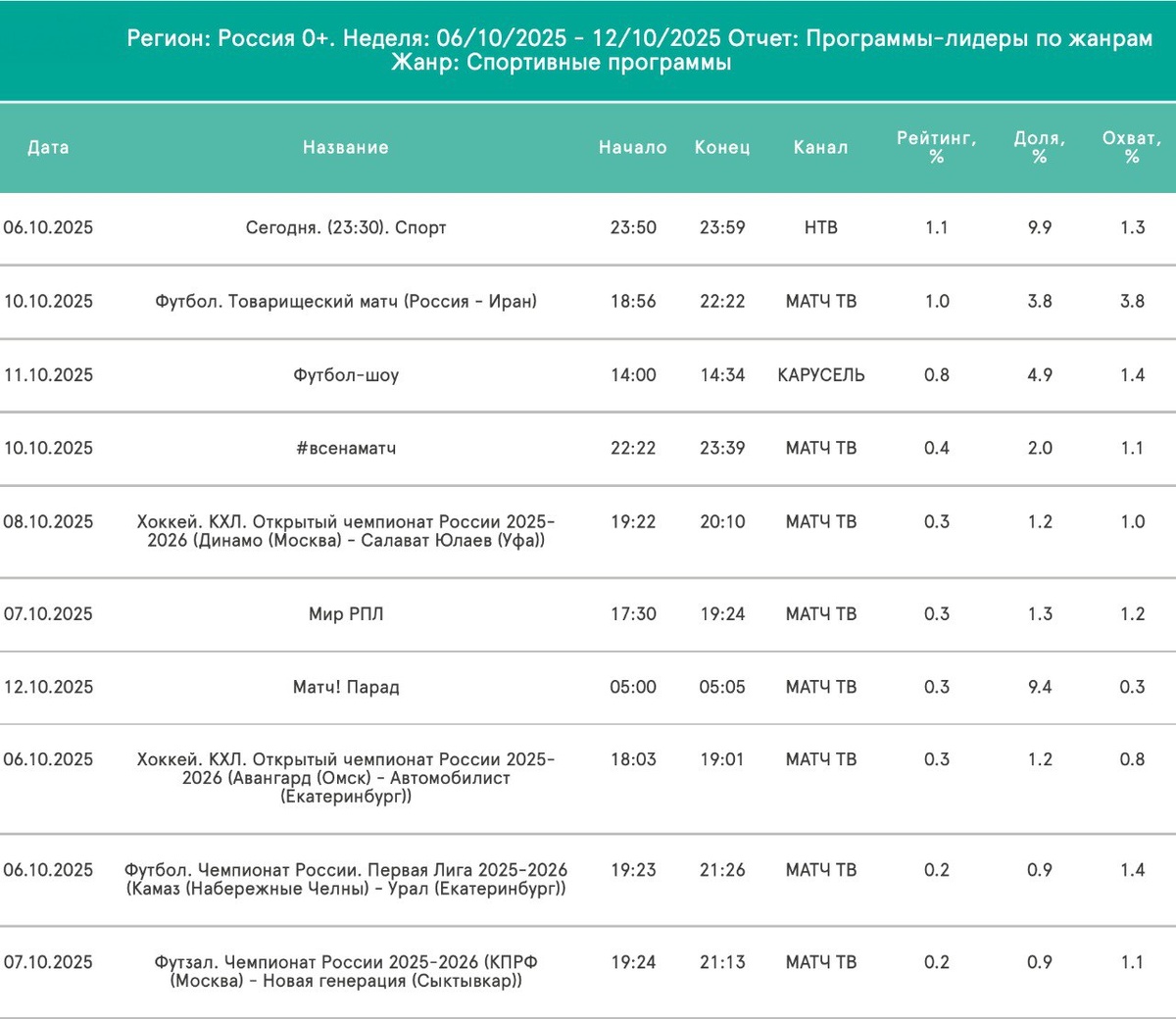 «ЧТО ПО ТЕЛИКУ»? Итоги спортивного смотрения 06.10-12.10, Россия, 4+ (137,4 млн чел.) 🗣 Товарищеский матч Россия - Иран набрал единичку рейтинга и залетел в топ-5 сезона. Один балл сумели пробить: "Краснодар" (4 раза), "Зенит", "Спартак", ЦСКА и сборная России (по 2 раза). 🗣 На этой неделе уже была трансляция товарняка национальной команды с Боливией, а в выходные на "Матч ТВ" возвращается РПЛ: покажут матчи "Крылья" - "Оренбург" и "Локомотив" - ЦСКА. "Спартак" - "Ростов" смотрим на платнике в субботу в 15:15. Топ 25/26: 1.2 - 🟢:🔵| ⚫️ 1.1 - 🔴:🔵| ⚫️ 1.1 - 🇶🇦:🇷🇺 | ТМ 1.1 - ❤️:🔴| ⚫️ 1.0 - ❤️:❤️| ⚫️ 1.0 - ❤️:🔵| ⚫️ 1.0 - ❤️:❤️| ⚫️ 1.0 - 🇷🇺:🇮🇷 | ТМ 0.9 - 🏒 | ТМ (🌟) 0.9 - 🔵:🟡| ⚫️ 0.9 - 🏊♂ | ЧМ 0.9 - 🟢:🔵| ⚫️ 0.9 - 🔴:🔵| 🏆 0.9 - 🇷🇺: 🇯🇴 | ТМ 0.9 - 🔴:🟡| 🏆 0.8 - 🔴:🔵| ⚫️ 0.8 - 🏊♂ | ЧМ 0.8 - 🔵:❤️| ⚫️ 0.8 - ❤️:🔴| ⚫️ 0.8 - 🔵:❤️| ⚫️ 0.8 - 🔴:🔴| ⚫️ 0.8 - 🔵:❤️| 🏆 0.8 - 🔵:🔵| 🏆 0.8 - 🔵:🔵| ⚫️ 0.8 - 🔴:🟠 | ⚫️ 0.8 - ❤️:🟠| 🏆 0.8 - 🔵:❤️| ⚫️ Игры ❤️ на "Ма