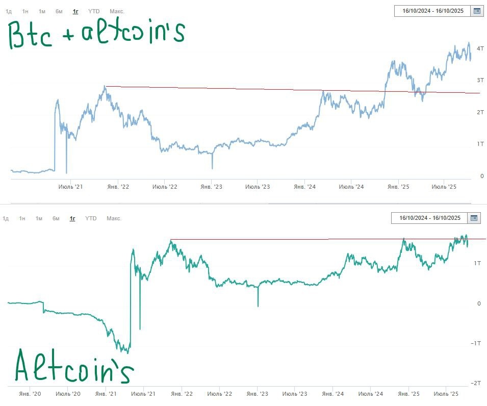#аналитика 🚀 Рынок криптовалют Показывает интересную динамику - с декабря 2024 года капитализация Bitcoin растет, а капитализация альткоинов не растет. Напрашивается несколько выводов: 1) Альты фуфло; 2) Рынок выбирает Bitcoin, и голосует за него долларом; 3) Альтсезон ещё и не начинался. "Но это не точно..." Кстати, сегодня на инвестинге проведу эфир. Сегодня подробно изучил их платформу - очень интересный и содержательный инструмент для анализа рынка 📝