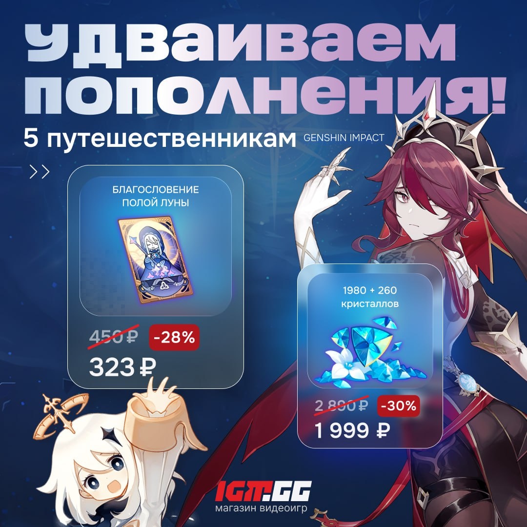Сервис пополнения IGМ удваивает донаты в игры! Пополняйте свои аккаунты в Genshin, Honkai: Star Rail, Mobile Legends и других играх через сервис IGM.GG с 16 по 19 октября, а уже в понедельник 5 случайных пользователей получат удвоение своего заказа! Купили 300 кристалов? Получите ещё 300 в подарок. Итоги подведут 20 октября в сообществе HoYoMania. Пополняем валюту выгодно здесь!
