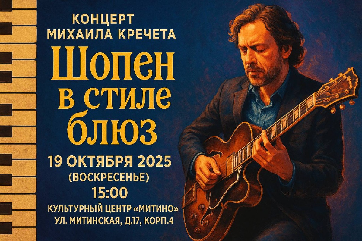 🎶 Концерт Михаила Кречета «Шопен в стиле блюз» 6+ 📍 Культурный центр «Митино», ул. Митинская, д.17, корп.4 📅 19 октября 2025 (воскресенье) 🕒 15:00 🎟 Вход свободный ✨ Культурный центр «Митино» приглашает всех на необычный музыкальный эксперимент — авторскую программу Михаила Кречета «Шопен в стиле блюз». Это будет диалог между прошлым и будущим, где классика Фридерика Шопена приобретает новое дыхание в ритмах блюза. 🎸 Михаил Кречет — гитарист и композитор, участник крупнейших рок-фестивалей, сегодня ищет возвышенную элегантность и глубину в звучании. Его проект — это попытка взглянуть на музыку гения по-новому, через чувства и размышления. 💡 Присоединяйтесь к этому творческому эксперименту и почувствуйте, как Шопен звучит в стиле блюз! 🔗 Регистрация на mos.ru 📞 +7 (495) 794-03-61 #Шопен #МихаилКречет #КультурныйЦентрМитино #Митино #СЗАО #Москва #Концерт #Бесплатно #Музыка #Блюз #ШопенВСтилеБлюз #ОКЦСЗАО