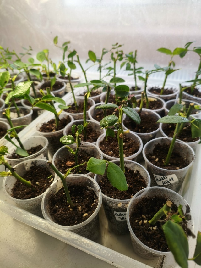 Крым, Симферополь, Россия. Октябрь 2025 Я много раз уже писала о том, что у нас в Крыму розы хорошо черенкуются и идут в рост именно осенью. Летнее черенкование в этом году тоже было довольно удачным, так как июнь у нас получился не таким жарким. Но прирост летом был довольно слабым из-за жары в июле и августе, розы плохо наращивали корневую и не давали побеги. Побеги у роз, отчеренкованнных в июне, пошли только сейчас. Кроме того, были постоянные проблемы из-за жары с клещом, а в конце августа появилась мучнистая роса (черенки в 500-литровых стаканах стояли в теплице). Сейчас стало прохладно. А, как известно, корни роз хорошо развиваются именно в прохладе. В первых числах сентября розы были отчеренкованы, в конце сентября была добавлена последняя партия. Пока было тепло, розы в стаканчиках в контейнерах стояли в уличной теплице. Но в этом году, в отличие от прошлого, осень в Крыму наступила рано, температуры ночью низкие. Всего 6 саженцев дали корешки, уже пересадила их в 500-литровые