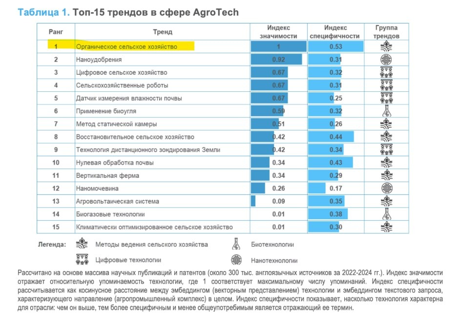 Современные технологии и сельское хозяйство, AgroTech /Внедрение высоких технологий, ИИ, автоматизация сельского хозяйства – это уже не тренд, а объективная реальность и необходимость. Институт статистических исследований и экономики знаний НИУ ВШЭ определил ключевые направления исследований и разработок в агропромышленном секторе, которые формируют траекторию его технологического развития. Органическое земледелие возглавило ТОП-15 трендов в AgroTech мирового АПК. На сегодняшний день вектор технологического развития сельского хозяйства определяется экологическими вызовами и запросом на оптимизацию и повышение производительности агропромышленных процессов. Для борьбы с опасными климатическими явлениями в агропромышленном комплексе внедряются нано- и биотехнологии, а также методы ведения сельского хозяйства, предполагающие более щадящее воздействие на окружающую среду. Для повышения эффективности агропроизводства применяются цифровые технологии: анализ больших данных, искусственный и