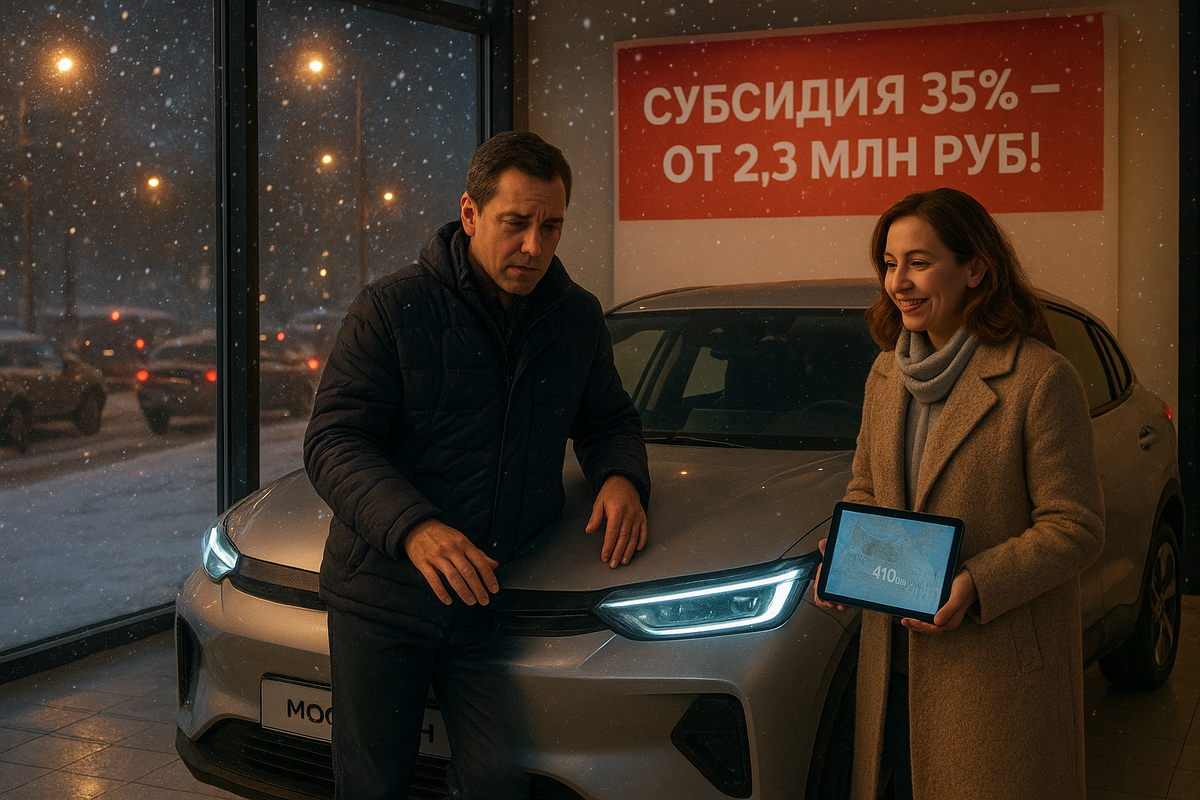 Я стоял у витрины автосалона и смотрел на него. На этот Москвич 3e, который казался чем-то из будущего. Блестящий, современный, совсем не похожий на те машины, что я помнил с детства. А рядом — яркий баннер: «Субсидия 35%!»