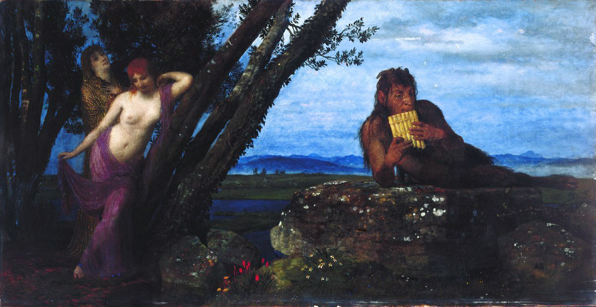 Арнольд Бёклин (1827-1901), родившийся в Швейцарии, впервые посетил Рим в 1850 году по совету известного историка искусств Якоба Буркхардта. Впоследствии Бёклин неоднократно возвращался в Италию, и окрестности Рима — реликвии прошлого оказали сильное влияние на его творчество. В 1874 году он на несколько лет переехал во Флоренцию, где и была написана его элегическая композиция «Весенний вечер». Пан, играющий на свирели, и спрятавшиеся в лесу нимфы (дриады), слушающие его музыку, предстают на фоне пейзажа как элементы умиротворяющего мира природы. Известно несколько версий этой сцены. Бёклин питал ностальгическую любовь к древним традициям Средиземноморья и гармоничному золотому веку единения с природой. С 1870-х годов его романтические пейзажи и идиллические сцены проникнуты мощной атмосферой, которая стала отличительной чертой самых значительных произведений художника. Его картины были наполнены мифологическими персонажами – сиренами, наядами, кентаврами и водяными. Насыщенные ц