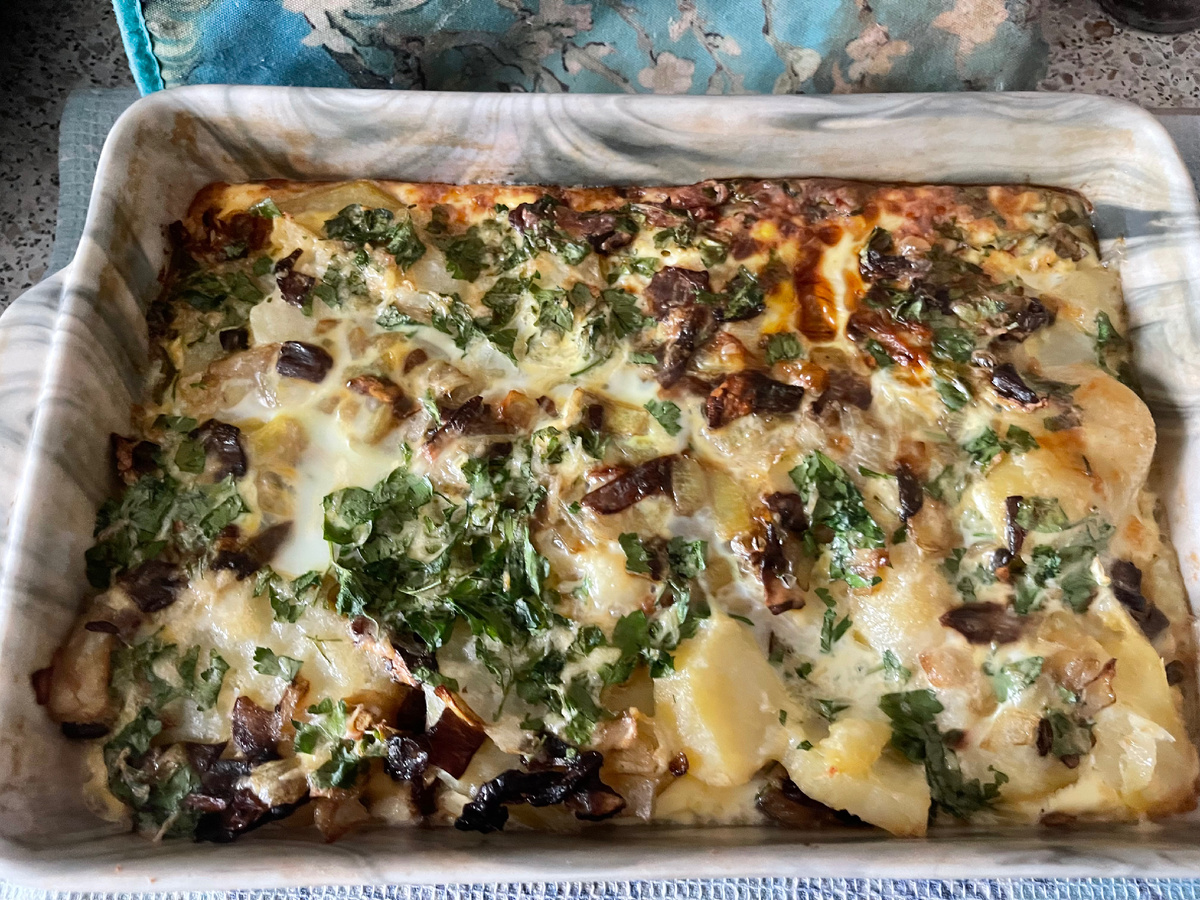 Ингредиенты: картофель - 800гр., 50 гр.сухих грибов (белых, подосиновиков, подберезовиков), 1 большая луковица , 4 яйца, 50 гр.твердого сыра, 200 мл.жирных сливок - 33%, 3 ст.ложки топленого масла , 3 веточки петрушки, соль и перец по вкусу . Приготовление : замочить сухие грибы в 2 литрах теплой воды. Затем вынуть их настоя, промыть от песка под проточной водой и мелко нарезать. Настой процедить через полотенце. Разогреть духовку о 170 градусов. Картофель очистить и сварить целиком в кипящем грибном настое до готовности, минут 20. Обсушить, остудить, нарезать небольшими ломтиками. Лук очистить и мелко нарезать, обжарить в растопленном масле 10 минут. Добавить грибы, жарить еще 5 минут, посолить, поперчить и снять с огня. Щедро смазать маслом глубокую прямоугольную или квадратную форму для выпечки. Смешать картофель и лук с грибами . Выложить получившуюся массу в форму ровным слоем. Взбить яйца со сливками, добавить к ним натертый на мелкой сыр и мелко ру
