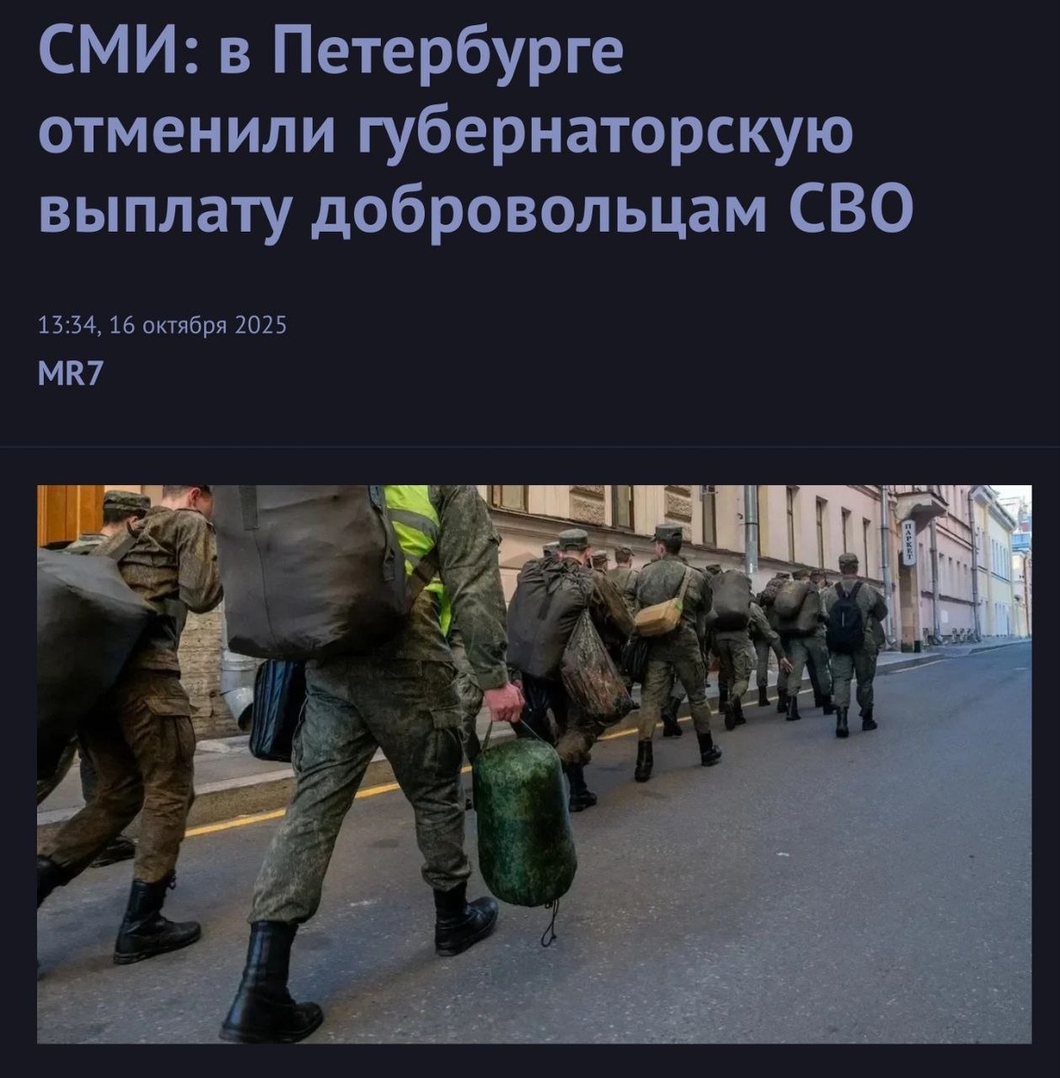 💵 В Петербурге Беглов отменил выплату в 1,6 млн. рублей для добровольцев, что уходят на СВО Как сообщает издание «Фонтанка», выплату 1,6 млн рублей за добровольное участие жителей Санкт-Петербурга в спецоперации отменили. О проблемах с получением выплаты сообщили изданию сразу несколько военнослужащих, которые подписали в августе контракт о прохождении военной службы в составе добровольческого формирования «БАРС». По словам военных, не дождавшись денег, они обратились в районные отделы социальной защиты населения. Там сообщили, что деньги им не положены, поскольку 26 августа 2025 года было принято постановление правительства Петербурга, согласно которому 1,6 млн рублей не перечисляются с 1 августа. Ранее также стало известно о резком снижении подобных выплат и в других регионах России: в Чувашии, Марий Эл, Нижерогородской области, ЯНАО и др. Очень похоже, что элита начинает экономить и на аспектах связанных с СВО, проблемы огромной дыры в бюджете нарастают.