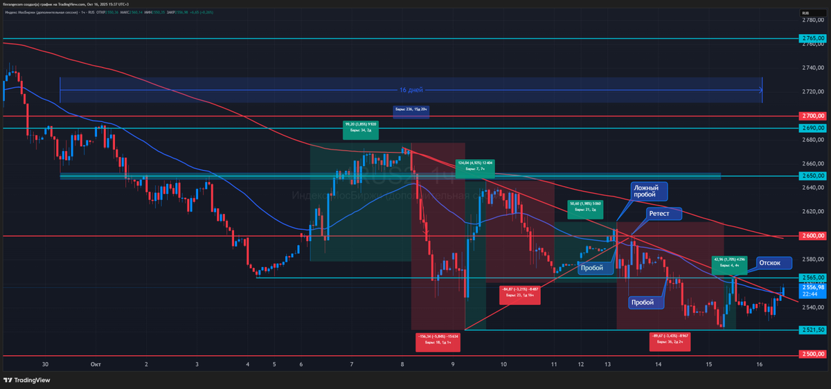 Российский рынок акций продолжает сползать к своим минимумам на пониженных объёмах на фоне укрепления рубля и снижения цен на нефть. Как только мы подошли к минимумам прошлой недели, в обед опубликовали новости о том, что Минэнерго не видит необходимости законодательно закреплять направление дивпотока энергокомпаний на инвестиции. Так как все компании государственные этого и не нужно, но на рынке ищут поводы отскочить и развернуться. В итоге в обед была очередная попытка отскока в отсутствии объёмов, но и как предыдущие дни, индекс МосБиржи не смог развить отскок. От уровня сопротивления около 2565 пунктов и линии тренда, снова развернулись и пошли к минимумам 2521,5 пунктов. Давление на рынок оказали недельные данные по инфляции с 7 по 13 октября, которая показывает рост шестую неделю подряд, причём вторую неделю выше 0,2% н/н. Таким образом, статистика по инфляции лишь увеличила неопределенность относительно дальнейшей денежно-кредитной политики ЦБ. Участники рынка не готовы активно
