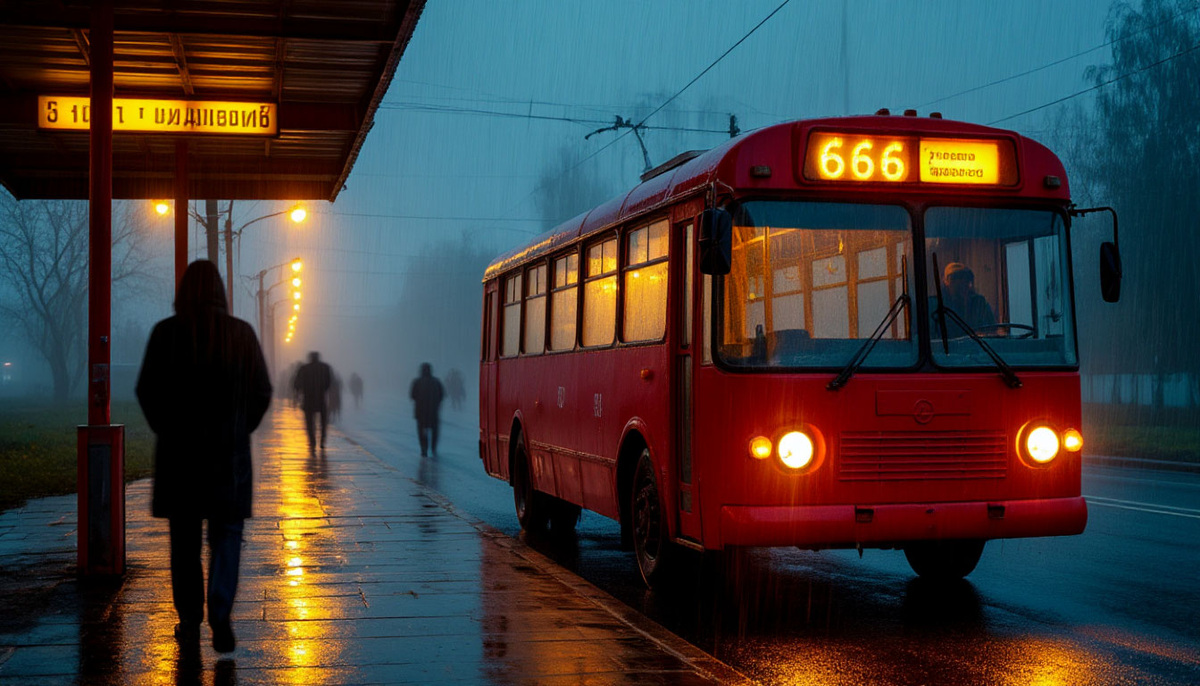 Телефон показывал 23:15. Минут через десять вижу — едет автобус. Старый такой, красный с белой полосой, как в моём детстве были. Подъезжает, и я вижу номер — 666. Чёрт, думаю, шутники в автопарке. Но делать нечего — дождь усиливается, а завтра в семь утра опять на объект.