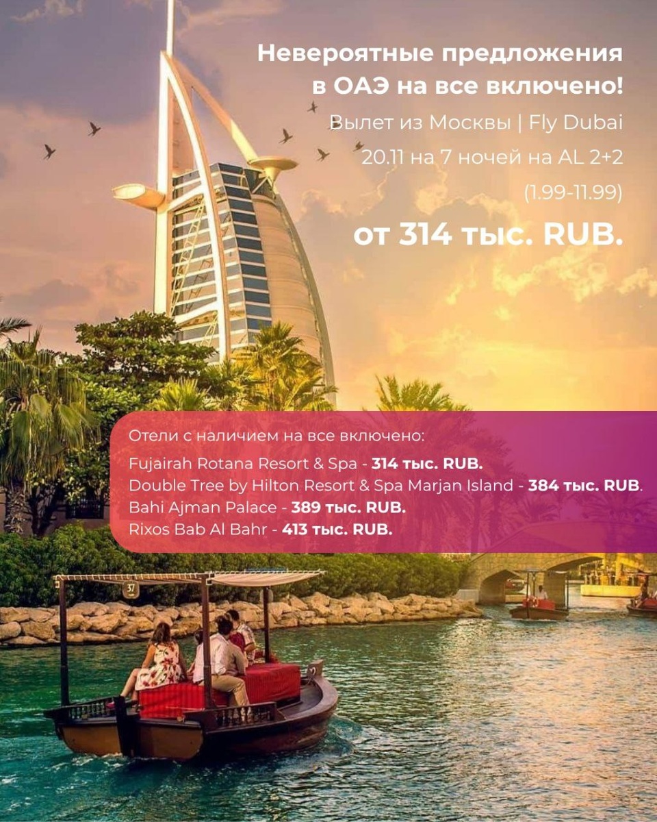 🇦🇪 Невероятные предложения в ОАЭ на все включено! ✈️ Вылет из Москвы | Fly Dubai 🗓️ 20.11 на 7 ночей на AL 2+2 (1.99-11.99) от 314 тыс. RUB. ✅ Отели с наличием на все включено: ✨Fujairah Rotana Resort & Spa - 314 тыс. RUB. ✨Fairmont Fujairah Beach Resort - 332 тыс. RUB. ✨Double Tree by Hilton Resort & Spa Marjan Island - 384 тыс. RUB. ✨Bahi Ajman Palace - 389 тыс. RUB. ✨Rixos Bab Al Bahr - 413 тыс. RUB. ✨Address Beach Fujairah Resort - 549 тыс. RUB. Забронировать тур и задать вопросы: ☎️ +7 (905) 717-51-97 Вера 💬Написать в WhatsApp 💬Написать в Telegram Отзывы обо мне 🙂