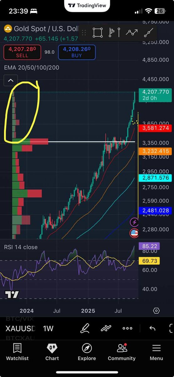 Когда золото задыхается — крипта начинает дышать На графике золота — чистый фрактал 2020 года. Резкий вертикальный взлёт без опоры на объём, RSI в зоне экстремума, свечи вытянуты, как струна перед обрывом. Тогда рынок закончил перегревом и долгой коррекцией — золото пошло в боковик, а ликвидность утекла в биткоин. Сейчас всё повторяется: цена далеко выше EMA 50–100, профиль объёма пуст, поддержек нет. Если начнётся коррекция (а она начнётся), капитал пойдёт искать новое убежище. И, скорее всего, снова в крипту. И вот что интересно: в прошлый раз, когда золото шло в коррекцию, именно в этот момент начинался сильный рост по биткоину. Тогда капитал просто перетёк из защитных активов в рисковые. Если история хоть чуть рифмуется, коррекция по золоту станет не обвалом, а триггером перетока ликвидности в крипторынок. Так что, ждем... ⏳ #bitcoin #золото #рынки #инвестиции
