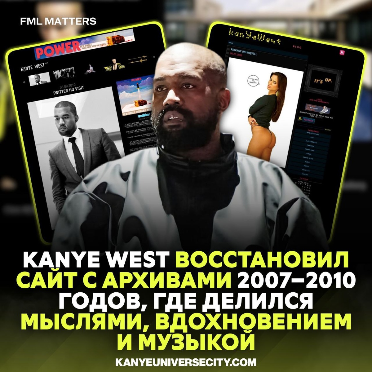 ✔️ KANYE WEST ВОЗРОДИЛ СВОЙ БЛОГ! Йе неожиданно восстановил свой культовый сайт KanyeUniverseCity.com, который был активен с 2007 по 2010 год. На нём он когда-то делился личными мыслями, вдохновением, модой, архитектурой, искусством и музыкой — фактически это был его цифровой дневник, где он показывал, как формировалось его видение и вкус. Уже успели заценить?❤️🔥 / 👎 💀 FML MATTERS