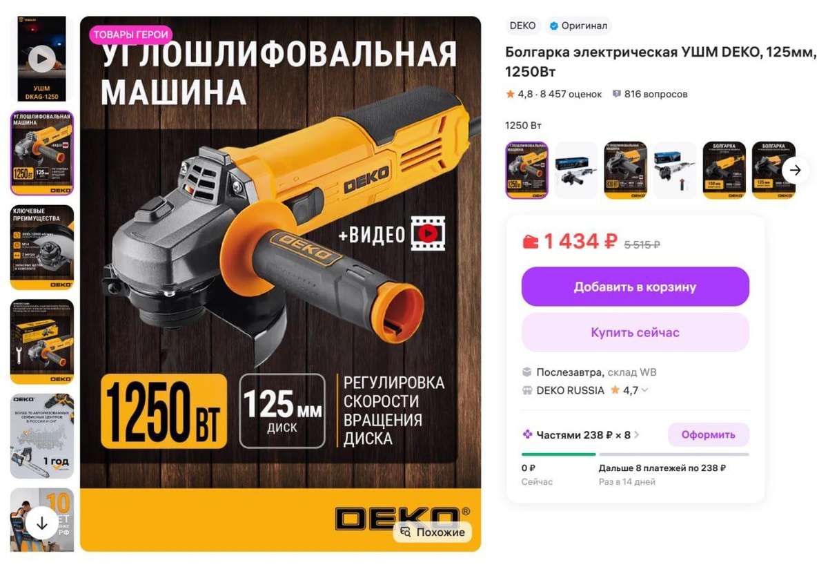 DEKO Болгарка электрическая УШМ DEKO, 125мм, 1250Вт за 1434₽