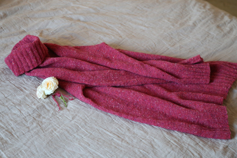 Ягодный свитер из твида Донегал, что вчера упоминался, оказывается, здесь не показывала. Свитер был связан давно, ещё на прошлой неделе ... ух ты ж подсматривает в тетрадку, даже записи сохранились: начато 14.09.2024, окончено 15.11.2024. Не так давно, оказывается, но видимо, откладывался из-за потери интереса, потому что 2 месяца для небольшого свитера на спицах №3,5 - это долго (по моим нынешним меркам, когда в ходу спицы №3,0 и свитера ок. 75 см длиной). Свитер из пряжи Donegal Tweed Soft однониточный, 380м/100г, спицы 3,5 на основное полотно. Связан простой лицевой гладью, воротник и манжеты - резинкой 2х2 на спицах 3,0. Вес около 260 грамм, по фасону - свободная водолазка, я бы так назвала. Длина изделия 60-62 см, размер 42-44. Цвет пряжи называется 5522 BROSNA, собственно этот текст и должен иллюстрировать цвет, а не фасон. Дело в том, что произошла некоторая путаница в фотографиях из-за того, что свитеров из этой пряжи было связано два. Один - водолазка, а второй - годом или дву